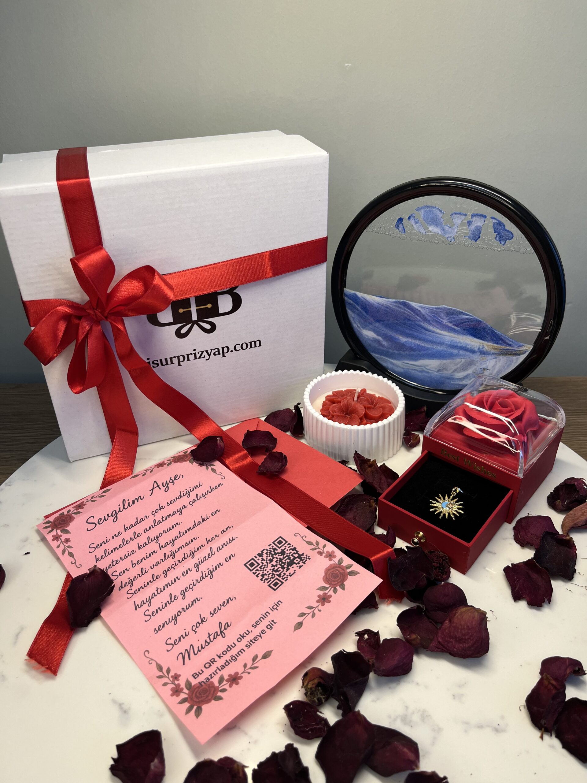 🕯️ Özel Tasarım Mum: Romantik atmosferi tamamlayan el yapımı mum, sevginizin sıcaklığını yansıtır.
