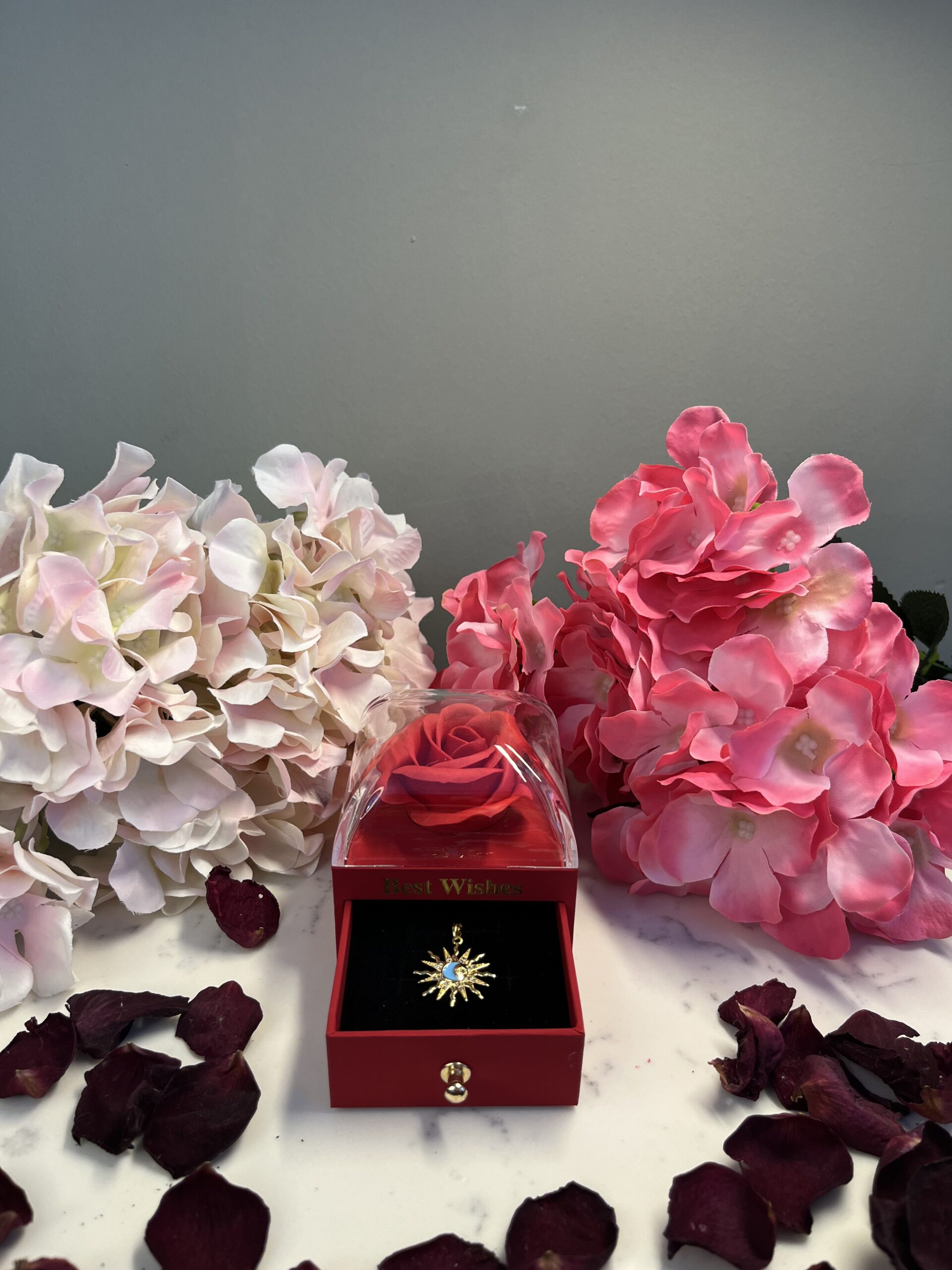 💍 Çekmeceli Kolye Kutusu & Kolye: Zarif bir kolye ve şık çekmeceli kutusu, aşk kutunuza hem anlam hem de estetik katar.