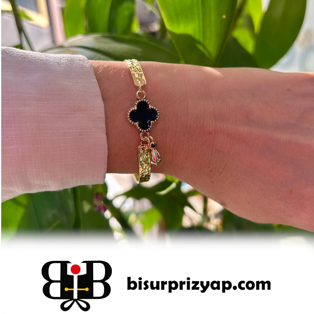 VIP Siyah Yonca Kelepçe Model Bileklik | Şık ve Şanslı Aksesuar